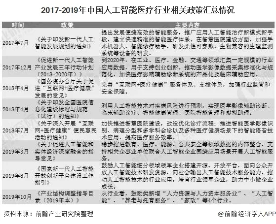 我国人工智能医疗政策的发展呈现出“由上到下”的特点,即从国家宏观层面出台指导性文件和发展规划,为人工智能研发和应用提出指导路线,各地政府根据中央指导意见出台相关执行文件,在工信部印发的《促进新一代人工智能产业发展三年行动计划(2018-2020年)》中提出在医疗影像、智能服务机器人等细分行业的发展目标,明确发展方向。