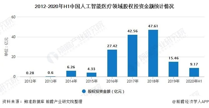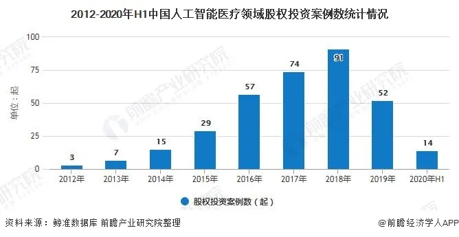 从投资案例看,2012-2020年上半年,我国人工智能医疗领域股权投资热度呈现先增后降趋势,其中股权投资热度较高的年份为2016年、2017年和2018年。2019年,受到资本寒冬影响,人工智能医疗领域投资热度有所回落,投资案例数下滑至52起,投资金额为15.46亿元。2020年上半年,由于新冠疫情的影响,投资案例数量依然处于低位,未有明显回升,上半年投资数量为14起,投资金额为9.17亿元。