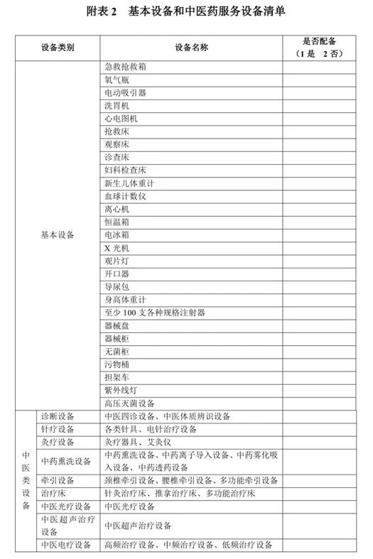 全国乡镇卫生院和社区卫生服务中心还需要配备下述图中90%以上的基本医疗设备,并配备6种以上的中医诊疗设备和康复设备,以及要拥有 DR、彩超、全自动生化分析仪、血凝仪、十二导联心电图机、空气消毒机、麻醉机、胃镜、呼吸机以及 CT、急救型救护车、全自动化学发光免疫分析仪等设备等。