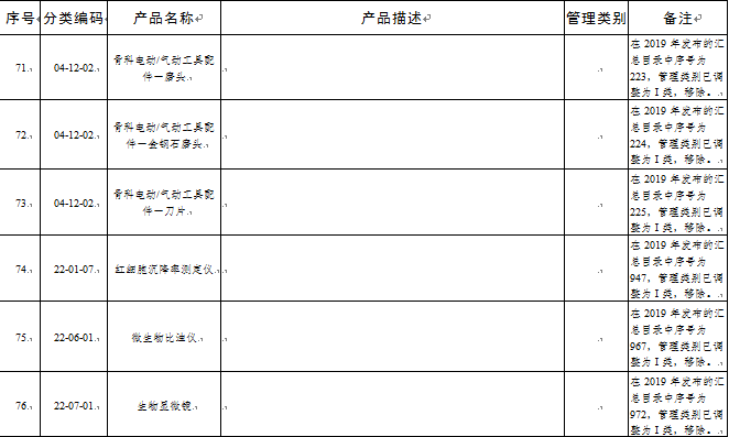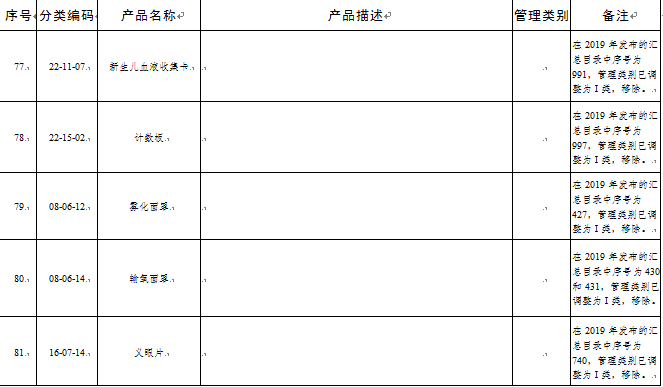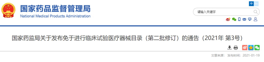 2018年9月,国家药品监督管理局印发《关于公布新修订免于进行临床试验医疗器械目录的通告》(2018年第94号),对前期已发布的免于进行临床试验的医疗器械(及体外诊断试剂)目录进行了全面修订和汇总,分别印发了修订汇总后的《免于进行临床试验的医疗器械目录》和《免于进行临床试验的体外诊断试剂目录》。在此基础上,2019年12月,国家药品监督管理局印发《关于公布新增和修订的免于进行临床试验医疗器械目录的通告》(2019年第91号),公布了第一批新增和修订的免于进行临床试验的医疗器械(及体外诊断试剂)目录。