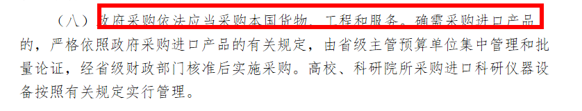 与此同时,通知还强调政府采购依法应当采购本国货物、工程和服务。对于确需采购进口产品的,须由省级主管预算单位集中管理和批量论证,经省级财政部门核准后实施采购,市级主管预算单位不再进行审核。