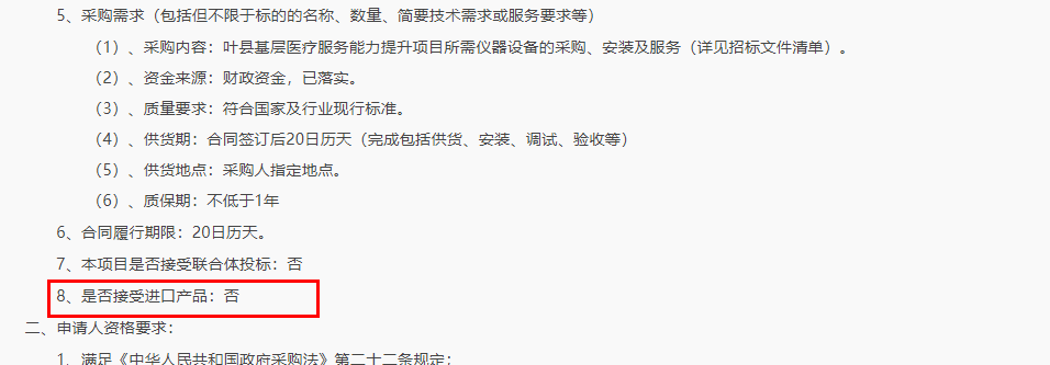 此前,陕西省卫生健康委发布的《预算单位政府采购进口产品管理办法》中,还明确各单位在开展医疗、教学科研等工作需要采购进口设备的,应当符合以下条件之一: